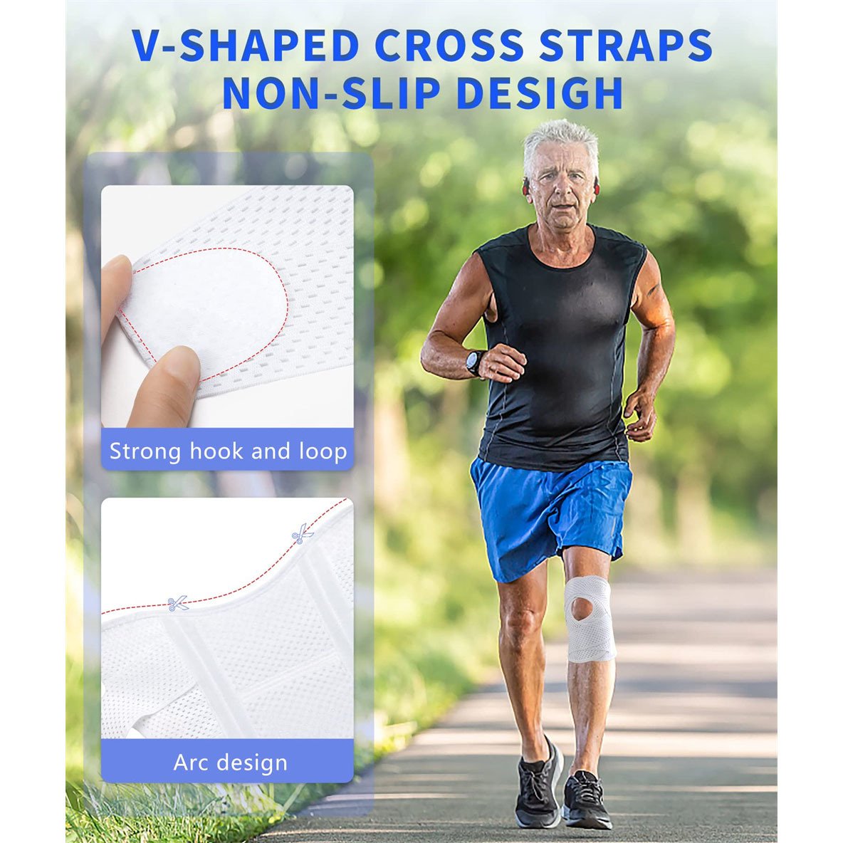 Secure Fit with Dual V-Shaped Velcro: Our knee brace stands out with dual V-shaped adjustable straps, preventing slipping during activities. Its ergonomic design and center patella opening ensure a stable fit, offering superior stability compared to other products.